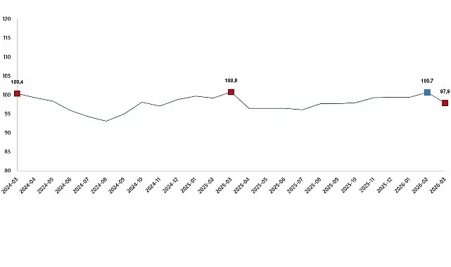Ekonomik güven endeksi Şubat ayında 100,7 iken, Mart ayında %2,8 oranında azalarak 97,9 değerini aldı.